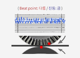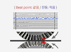 As shown in the illustration, the brush to brush configuration generates minimal vibration because the contact points between the strip surface and the upper and lower Brush Rolls are aligned.