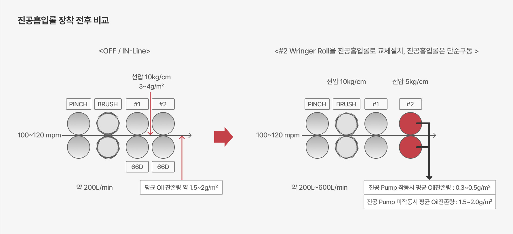 - 洗浄油を使用して洗浄する方式で、製品表面の油分や異物除去に高い効果があります。Brush Roll、不織布 Wringer Roll、Vacuum Roll を適用し、製品表面の残留油量を適切に調整することで、Press 作業性の向上に寄与します。