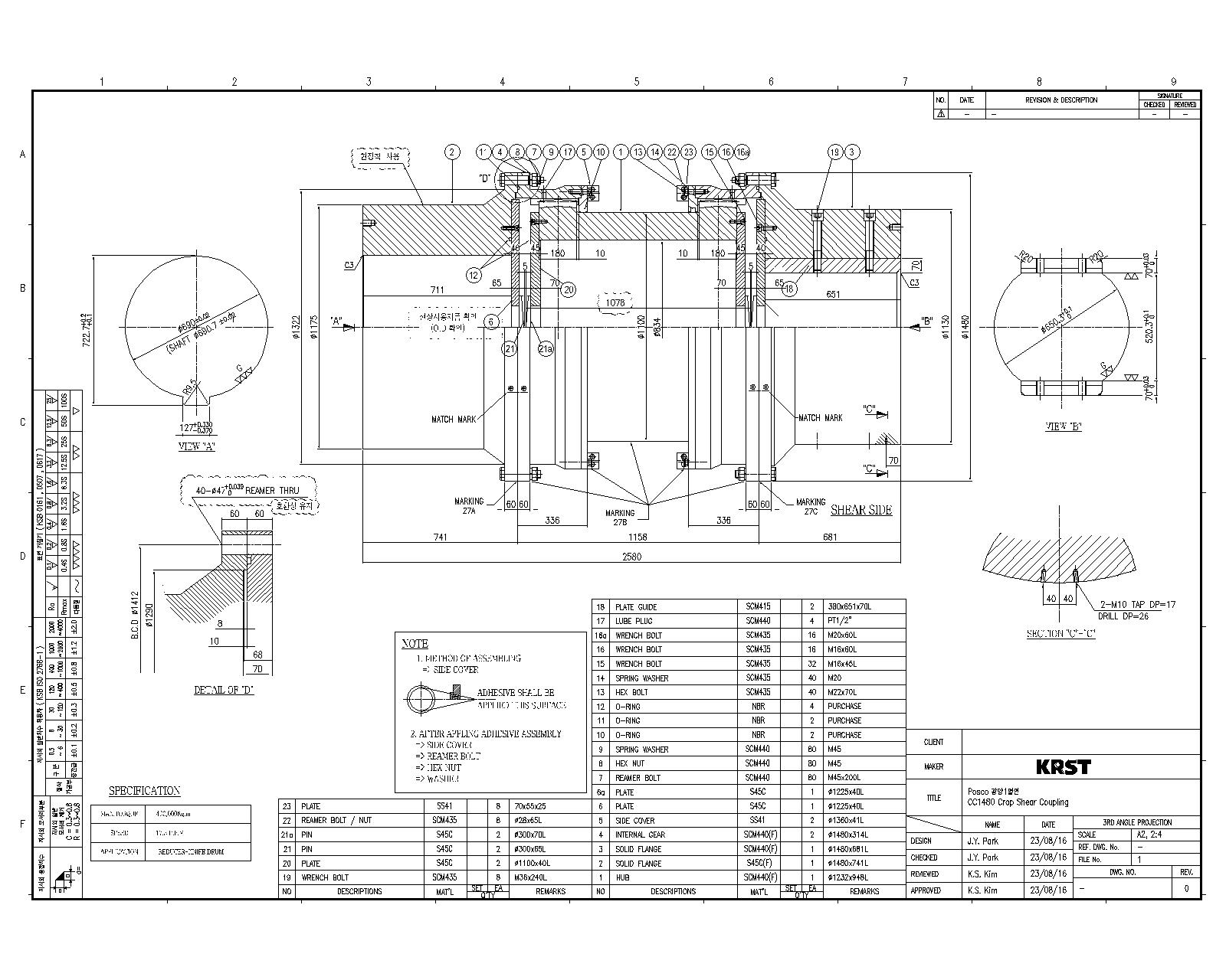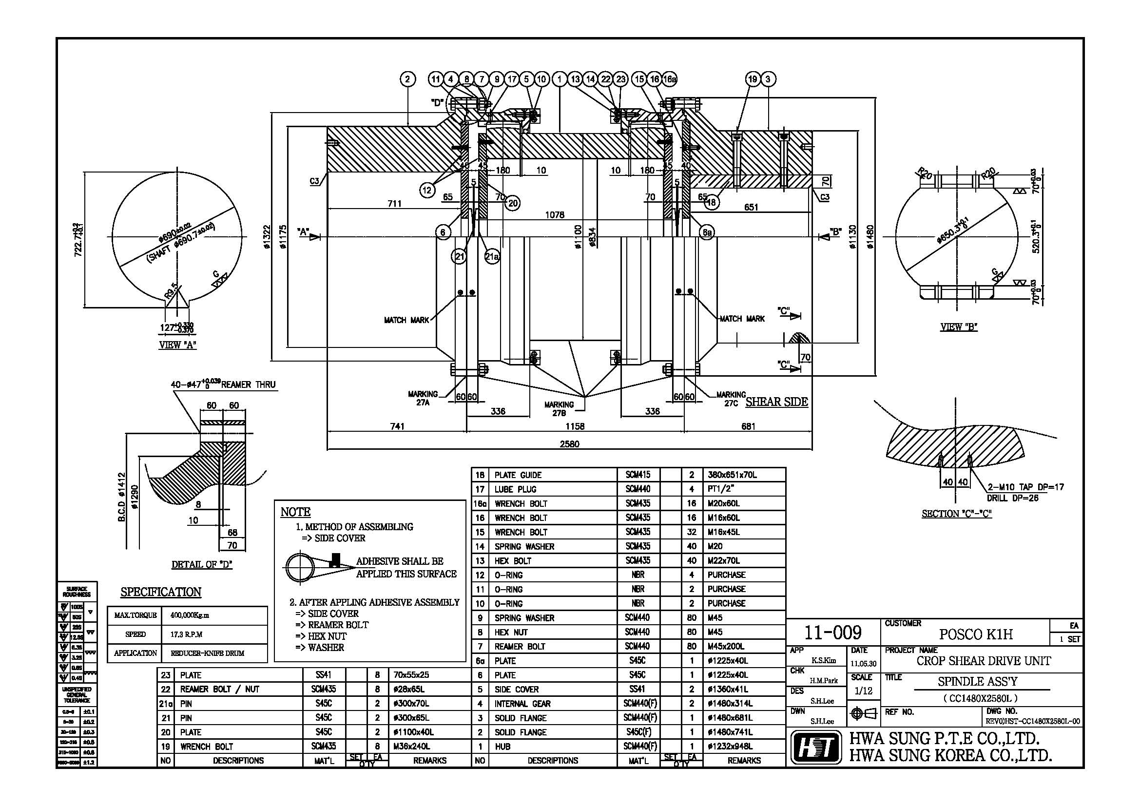 Crop Shear Knife Drive Unit은 Billet (압연재)의 앞부분의 불량한 부분을 절단하여 Coil을 형성하는데 사고를 방지하고, 작업효율을 능률적으로 할 목적으로 설치된 설비 입니다. Billet을 강한 힘으로 절단하는 목적이기에 가장 큰 힘을 적용이 되며, 그에 Universal Joint가 아닌 Gear로 사용하는게 보편적입니다. Gear부의 지속한 마모와 파손이 자주 발생하기에, 수리 및 납품이 원활한 국내제작이 필요하였고 2011년 외자품을 역설계하여 호환성을 맞추고 Gear치면의 마모를 강화하기 위해 소재및 열처리를 향상하여 공급을 하였습니다.